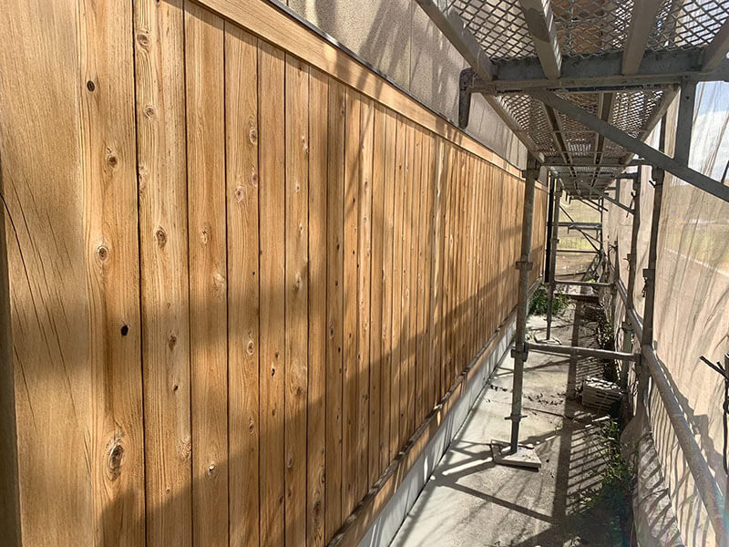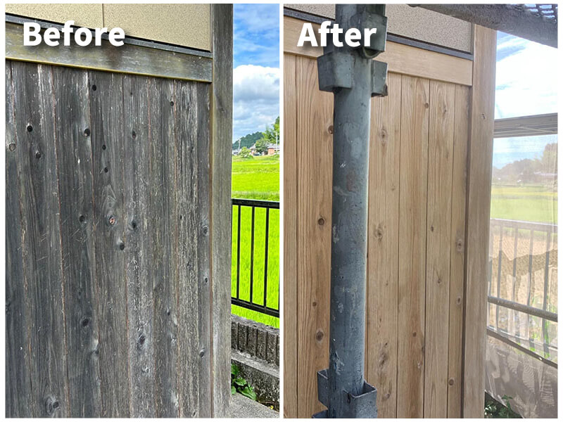 落とすことが難しいと思われがちな木材の洗浄を行い、美観修復いたしました。